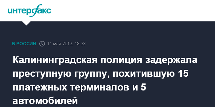 Калининград. 11 мая. INTERFAX.RU - Полиция Калининградской области разоблачила и задержала 4 человек, которые подозреваются в краже 15 терминалов и автомобилей.