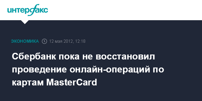 Москва. 12 мая. INTERFAX.RU - Сбербанк России пока не восстановил в штатном режиме проведение операций в интернете по картам MasterCard и Maestro, сообщили агентству "Интерфакс-АФИ" в банке. "Проблема не закрыта", - сказали в колл-центре кредитной организации.