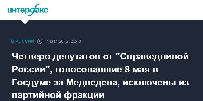 Москва. 14 мая. INTERFAX.RU - Четверо депутатов-"справороссов" исключены из думской фракции "Справедливая Россия", поскольку вопреки позиции фракции проголосовали за кандидатуру Дмитрия Медведева на должность премьера на заседании Госдумы 8 мая, сообщает лидер партии Сергей Миронов.