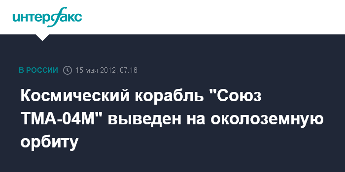 Байконур. 15 мая. ИНТЕРФАКС-АВН - Ракета-носитель "Союз ФГ", стартовавшая во вторник с космодрома Байконур, вывела пилотируемый космический корабль "Союз ТМА-04М" на околоземную орбиту, передает корреспондент "Интерфакса-АВН".