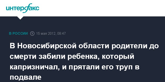 "По предварительной версии, родители забили до смерти своего пятилетнего сына, который капризничал. После чего они некоторое время прятали труп в подвале частного дома. В очередной раз уйдя в гости, старшую дочь они оставили одну. Ее крики и стуки в окна заметили соседи и вызвали полицию. Таким образом было обнаружено тело убитого ребенка", - сказал собеседник агентства.