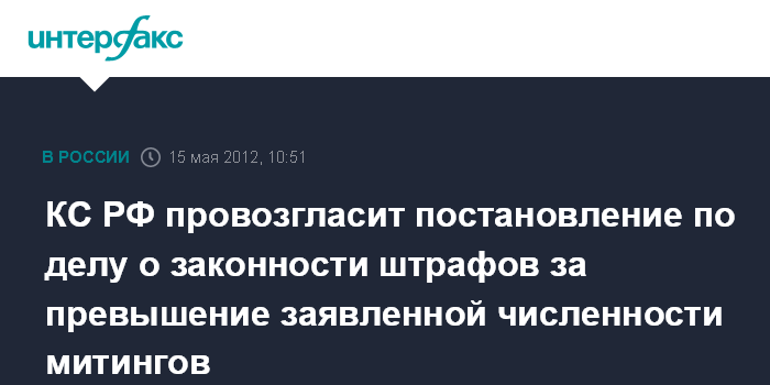 Санкт-Петербург. 15 мая. INTERFAX.RU - Конституционный суд РФ в пятницу провозгласит постановление по делу о проверке законности правовой нормы, по которой организаторы публичного мероприятия могут быть оштрафованы за превышение согласованной с властями численности участников.