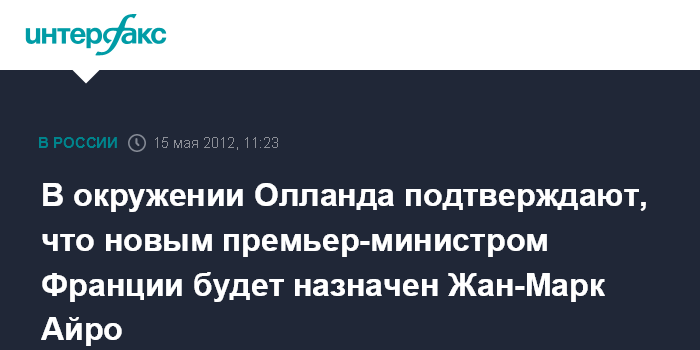 Париж. 15 мая. INTERFAX.RU - Приближенный избранного президента Франции Франсуа Олланда, бывший министр при Николя Саркози Жан-Пьер Жуйе, подтвердил во вторник утром в эфире RTL, что главой нового правительства будет назначен председатель фракции социалистов в Национальном собрании, заместитель мэра города Нанта Жан-Марк Айро.