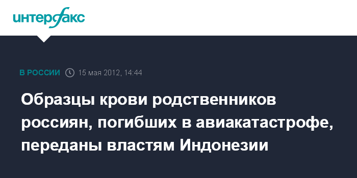 Москва.15 мая. INTERFAX.RU - Индонезийской стороне переданы образцы крови родственников россиян, погибших в результате катастрофы SSJ-100 в Индонезии, сообщил "Интерфаксу" официальный представитель СК РФ Владимир Маркин.