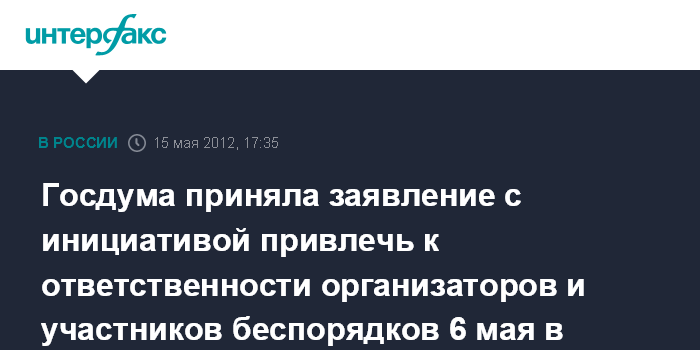 Москва. 15 мая. INTERFAX.RU - Госдума во вторник приняла большинством голосов инициированное фракцией "Единая Россия" заявление "О событиях 6 мая 2012 года в Москве", в нем выдвинуто требование привлечь к ответственности, в том числе уголовной, исполнителей, организаторов и подстрекателей беспорядков, допущенных в ходе массовых акций.