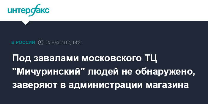 Москва. 15 мая. INTERFAX.RU - Администрация торгового центра "Мичуринский" сообщила спасателям, что людей под завалами в частично обрушившемся здании нет, сообщили "Интерфаксу" в пресс-службе сообщили "Интерфаксу" в пресс-службе ГУ МВД России по Москве МЧС России по Москве.