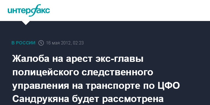 Москва. 16 мая. ИНТЕРФАКС - Мосгорсуд в среду рассмотрит жалобу адвокатов на арест бывшего начальника Следственного управления на транспорте по Центральному федеральному округу МВД РФ Эдуарда Сандрукяна, которого подозревают в мошенничестве.