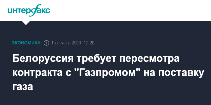 "При подписании того соглашения (31 декабря 2006 года - ИФ) мы опирались на российский прогноз изменения цены на нефть, который предполагал ее понижение. Поскольку и в российском, и в белорусском гражданских кодексах есть статьи о том, что договор может быть изменен или расторгнут в связи с существенными изменениями обстоятельств, мы предлагаем сесть за стол переговоров и либо расторгнуть договор, что недопустимо, либо дополнить, чтобы прийти к цивилизованному решению (по цене на газ для Белоруссии - ИФ)", - заявил Семашко, добавив, что в настоящее время Белоруссия и Россия находятся "в стадии переговоров".