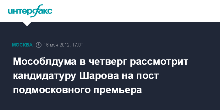 Москва. 16 мая. INTERFAX.RU - Депутаты Московской областной думы в четверг планируют рассмотреть вопрос о согласовании назначения на должность вице-губернатора - председателя правительства региона Андрея Шарова, сообщает пресс-служба областного парламента в среду.