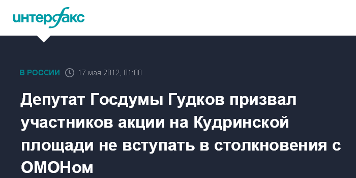 Москва. 17 мая. ИНТЕРФАКС - Представители полиции пообещали не задерживать участников оппозиционной акции на Кудринской площади при соблюдении общественного порядка, заявил депутат Госдумы Дмитрий Гудков собравшимся участникам мероприятия.