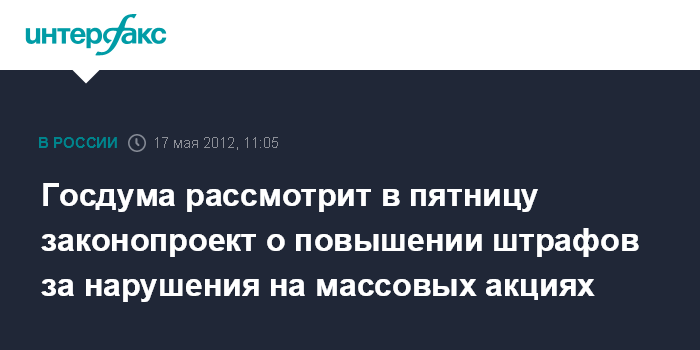 Москва. 17 мая. INTERFAX.RU - Совет Государственной Думы в четверг включил в повестку заседания на пятницу законопроект, увеличивающий до 1,5 млн рублей штрафы за противоправные действия при организации и проведении массовых акций.