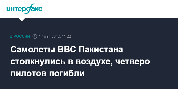 Исламабад. 17 мая. INTERFAX.RU - Столкновение в воздухе двух небольших тренировочных самолетов ВВС Пакистана привело к гибели всех четырех пилотов, сообщил в четверг местный телеканал "Дон-ТВ".