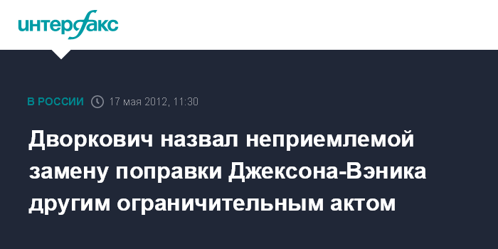 Москва. 17 мая. INTERFAX.RU - Россия не приемлет замену поправки Джексона-Вэника другим законодательным актом, который будет решать новые политические проблемы между Россией и США, "кажущиеся отдельным сенаторам, и в случае его принятия будет отвечать", заявил помощник президента РФ Аркадий Дворкович.
