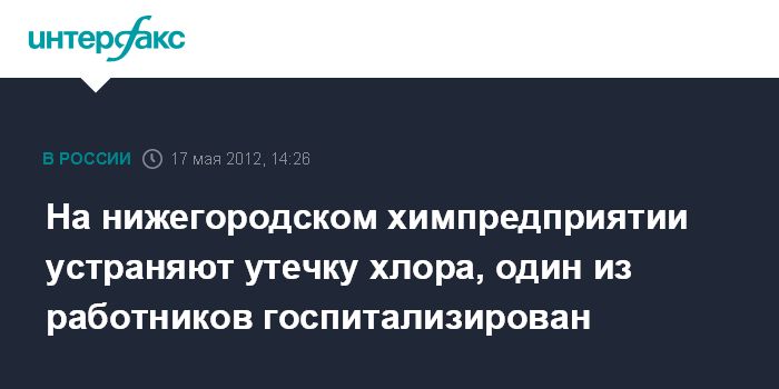 Нижний Новгород. 17 мая. INTERFAX.RU - Утечка хлора произошла в четверг на заводе "Корунд" в городе Дзержинске Нижегородской области, есть пострадавшие, сообщается на сайте предприятия.