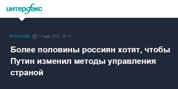 Как показал майский опрос Фонда "Общественное мнение" (ФОМ), 53% россиян хотят, чтобы Путин, вернувший на президентский пост, изменил стиль и методы управления страной, 29% предпочли, чтобы он работал так же как во время своих первых двух президентских сроков.