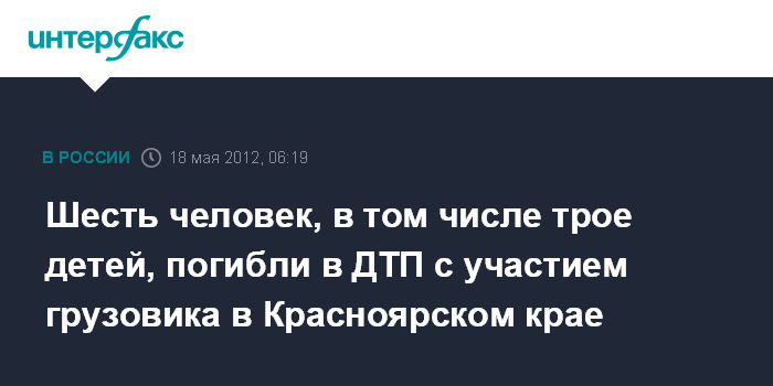 "Погибло в ДТП шесть человек (трое взрослых, три ребенка) все пассажиры автомобиля "Хонда". Травмирован один человек, водитель грузовика, пострадавшего отправили в ЦРБ Козульского района", - говорится в сообщении.