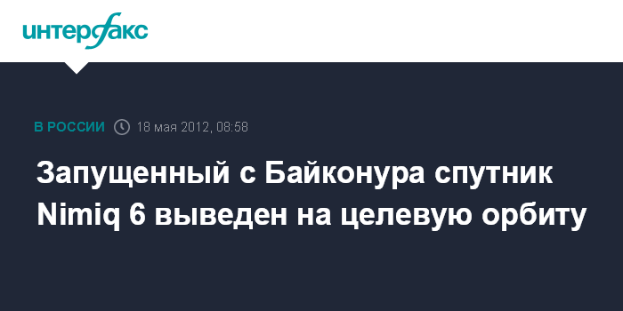Москва. 18 мая. INTERFAX.RU - Иностранный космический аппарат непосредственного вещания Nimiq 6 выведен на геостационарную орбиту с апогеем в 35 тыс. км с помощью российского разгонного блока "Бриз-М". "Зафиксировано отделение космического аппарата от разгонного блока.