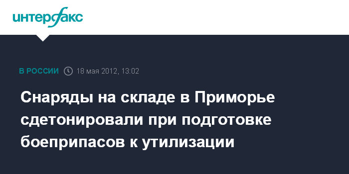 Владивосток. 18 мая. INTERFAX.RU - К пожару и взрывам боеприпасов на складе в Спасском районе Приморья привела детонация снаряда при отправке его на утилизацию.