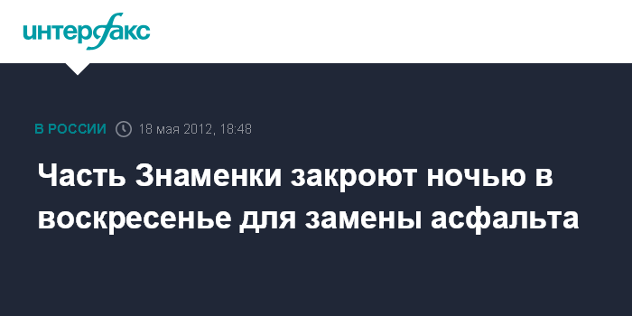 Москва. 18 мая. INTERFAX.RU - Часть улицы Знаменка, а также съезд с третьего транспортного кольца (ТТК) на проспект Андропова будут перекрыты в ночь на воскресенье в связи с заменой асфальта. "В связи с проведением работ по замене асфальтобетонного покрытия в ночь с 19 на 20 мая будет закрыта для движения проезжая часть улицы Знаменка. Объезд по Гоголевскому бульвару и улице Волхонка", - сообщил "Интерфаксу" в пятницу официальный представитель столичного управления ГИБДД Артем Иванов.
