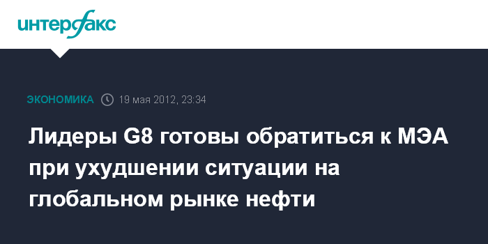 Вашингтон. 19 мая. ИНТЕРФАКС - Лидеры стран "большой восьмерки" в связи с ситуацией на рынке нефти готовы при необходимости призвать Международное энергетическое агентство принять меры для обеспечения полного и своевременного снабжения рынка.
