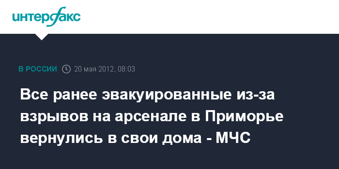 Владивосток. 20 мая. ИНТЕРФАКС-ДАЛЬНИЙ ВОСТОК - В Спасском районе Приморья завершена работа по возвращению в свои дома людей, которые были эвакуированы 18 мая из-за пожара и взрывов на армейском артиллерийском складе.