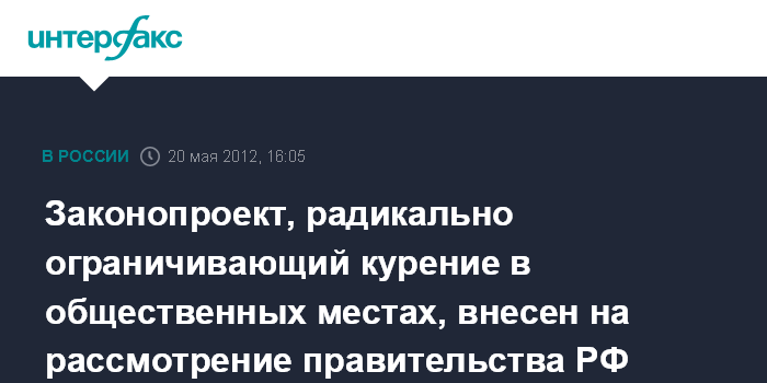 Москва. 20 мая. INTERFAX.RU - Министерство здравоохранения и социального развития внесло в правительство законопроект, радикально ограничивающий курение в общественных местах, сообщил в воскресенье сайт министерства. "Реализация в комплексе всех без исключения предлагаемых законопроектом мер в перспективе сократит курение на 40-50%, что может снизить смертность в России на 150 тысяч - 200 тысяч человек в год", - говорится в пресс-релизе Минздравсоцразвития.