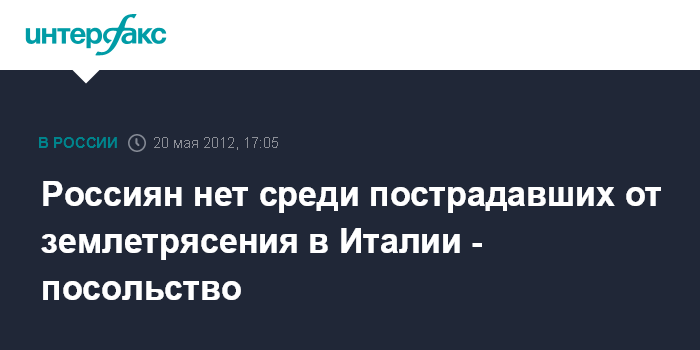 Рим. 20 мая. INTERFAX.RU - Российские туристы не пострадали от землетрясения в Италии. "В связи с землетрясением на севере Италии посольство России в Италии информирует, что среди пострадавших граждан России нет. Посольство находится в контакте с представителями итальянских спасательных служб", - говорится в сообщении российской дипмиссии.