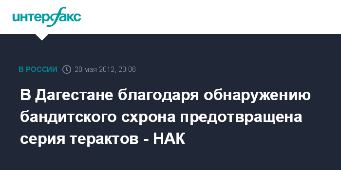 Москва. 20 мая. ИНТЕРФАКС - Уничтожение в Дагестане схрона боевиков, в котором было обнаружено более 100 кг взрывчатки, позволило предотвратить серию терактов на территории республики, сообщает Национальный антитеррористический комитет.