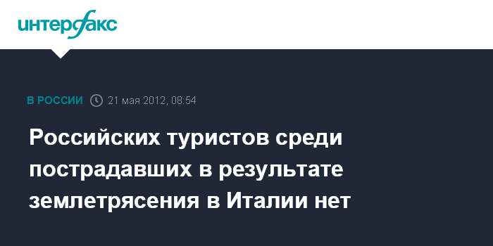 Москва. 21 мая. INTERFAX.RU - Российские туристы в результате землетрясения, произошедшего рано утром в воскресенье на северо-востоке Италии, не пострадали, сообщила исполнительный директор Ассоциации туроператоров России (АТОР) Майя Ломидзе.