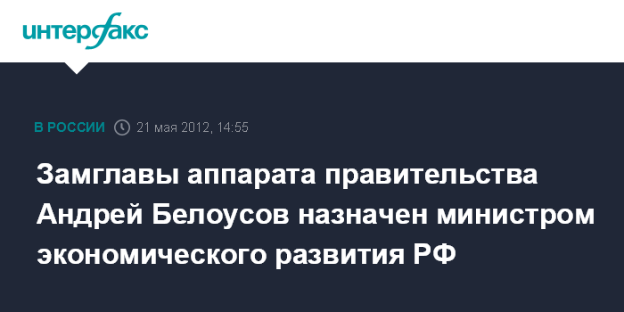 Москва. 21 мая. INTERFAX.RU - Замглавы аппарата правительства Андрей Белоусов назначен министром экономического развития РФ, заявил президент России Владимир Путин на встрече с новым составом правительства.