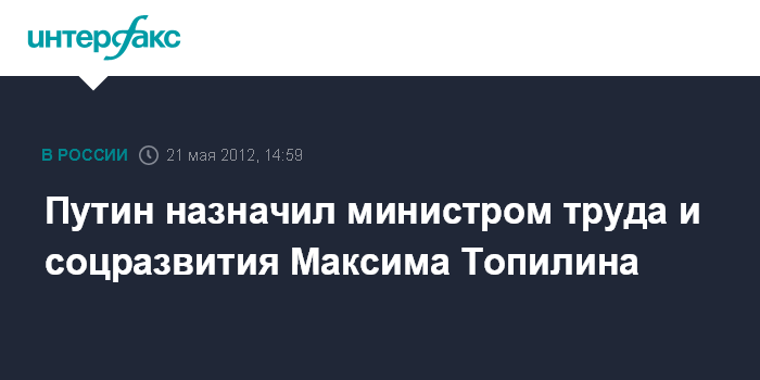 Москва. 21 мая. INTERFAX.RU - Президент России Владимир Путин назначил на пост министра труда и социального развития Максим Топилин.