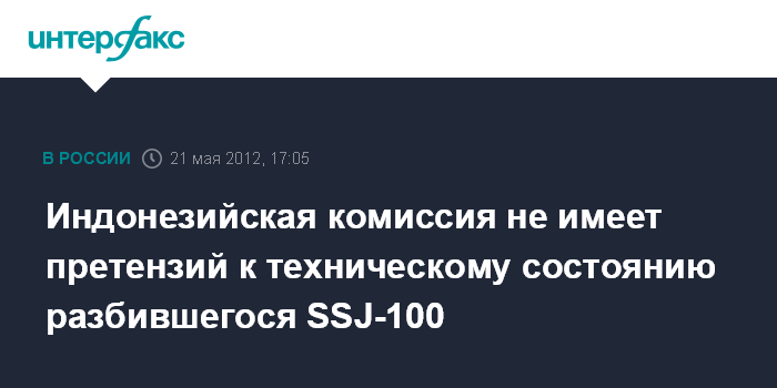 Москва. 21 мая. INTERFAX.RU - Индонезийская комиссия по расследованию причин крушения Sukhoi SuperJet-100 (SSJ-100) не имеет претензий к технической исправности разбившегося самолета, говорится в сообщении Минпромторга РФ.