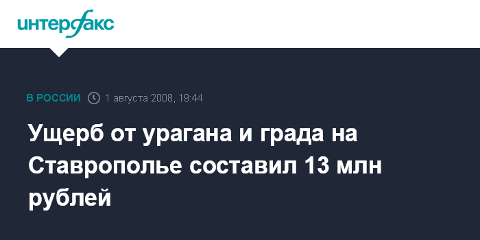 Ставрополь. 1 августа. ИНТЕРФАКС-ЮГ - Ущерб от последствий ураганного ветра и ливня с градом в городе Зеленокумске на Ставрополье составил 13 млн рублей, сообщили агентству "Интерфакс-Юг" в пресс-службе губернатора региона в пятницу.