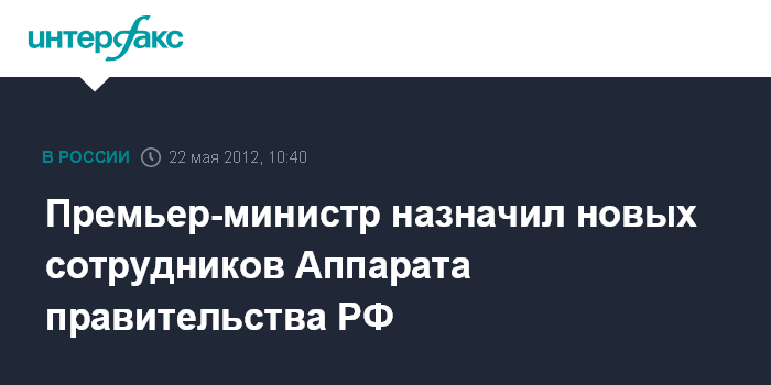 Москва. 22 мая. INTERFAX.RU - Председатель правительства России Дмитрий Медведев своими распоряжениями назначил ряд новых сотрудников Аппарата правительства РФ, сообщает во вторник пресс-служба правительства РФ.