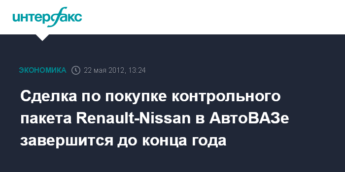 Москва. 22 мая. INTERFAX.RU - Глава "Ростехнологий" Сергей Чемезов сообщил, что сделка по покупке "Ренно-Ниссан" контрольного пакета в АвтоВАЗе будет завершена до конца текущего года.