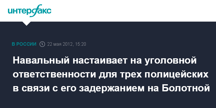 Москва. 22 мая. INTERFAX.RU - Оппозиционер Алексей Навальный просит следственные органы возбудить уголовное дело против столичных полицейских, задержавших его на "марше миллионов" 6 мая на Болотной площади.