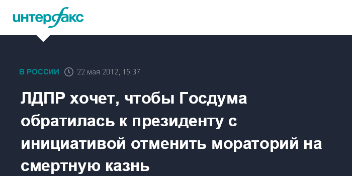 Москва. 22 мая. INTERFAX.RU - Члены фракции ЛДПР предложили Госдуме поставить перед президентом РФ Владимиром Путиным вопрос об отмене моратория на смертную казнь.