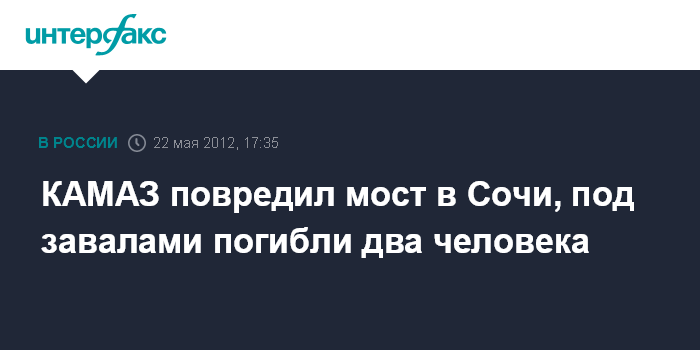 Сочи. 22 мая. INTERFAX.RU - В Хостинском районе Сочи, на улице Фабрициуса, дом 1, водитель КАМАЗа зацепил балку нового моста, и разрушил его.