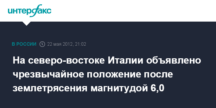 Рим. 22 мая. INTERFAX.RU - Власти Италии ввели режим чрезвычайного положения в провинциях на северо-востоке страны, где 20 мая произошло землетрясение магнитудой 6,0, говорится в заявлении правительства, распространенном во вторник. Режим ЧП будет действовать на протяжении 60 дней в провинциях Болонья, Модена и Феррара.