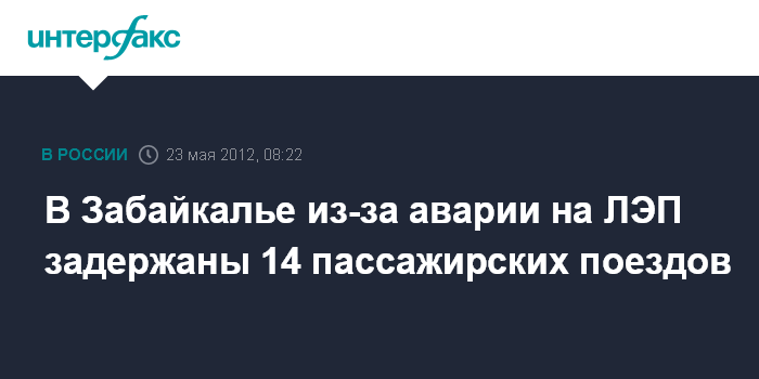 Чита. 23 мая. INTERFAX.RU - В Забайкальском крае во вторник из-за обрыва линии электропередач на участке Тарбагатай - Хилок было задержано 14 пассажирских поездов дальнего следования, сообщает в среду пресс-служба Забайкальской железной дороги.