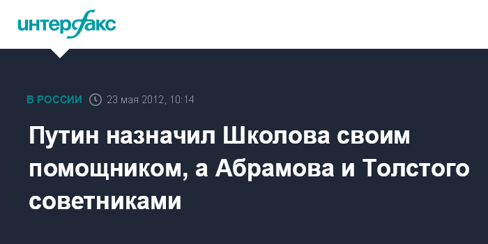 "В.Путин подписал ряд указов о назначении: Евгения Школова - помощником президента РФ; Александра Абрамова - советником президента РФ, освободив его от занимаемой должности; Владимира Толстого - советником президента РФ", - говорится в тексте указа.