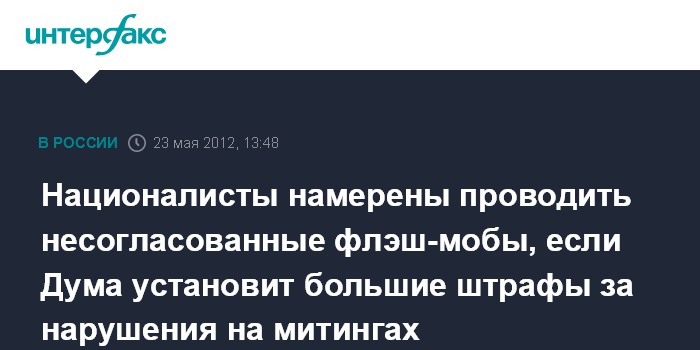 Москва. 23 мая. INTERFAX.RU - Националисты откажутся от согласования с властями массовых акций, если парламент примет закон об ужесточении штрафных санкций за нарушения на митингах.