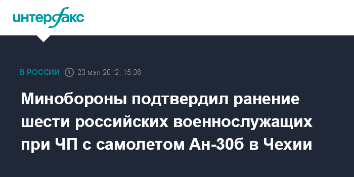 Москва. 23 мая. INTERFAX.RU - В результате авиационного происшествия с российским военным самолетом Ан-30Б на авиабазе в Чаславе (Чехия) пострадали шесть человек, сообщил "Интерфаксу-АВН" в среду начальник управления пресс-службы и информации Минобороны РФ полковник Игорь Конашенков.