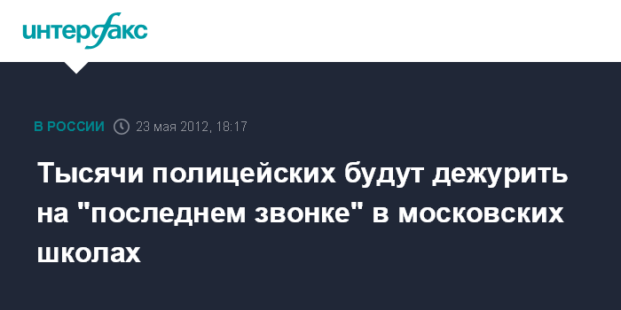 Москва. 23 мая. INTERFAX.RU - Безопасность в Москве в день "последнего звонка" 25 мая обеспечат около трех тысяч сотрудников полиции. "Более 50 тыс. выпускников из 1344 школ Москвы примут участие в "последнем звонке". Для обеспечения правопорядка планируется задействовать более трех тысяч полицейских и около тысячи сотрудников частных охранных предприятий и дружинников", - сообщили "Интерфаксу" в пресс-службе ГУ МВД по Москве.
