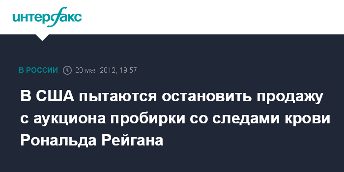Вашингтон. 23 мая. INTERFAX.RU - Американский Фонд Рональда Рейгана требует снять c торгов на Интернет-аукционе пробирку со следами крови бывшего президента страны, сообщает в среду телеканал CNN.