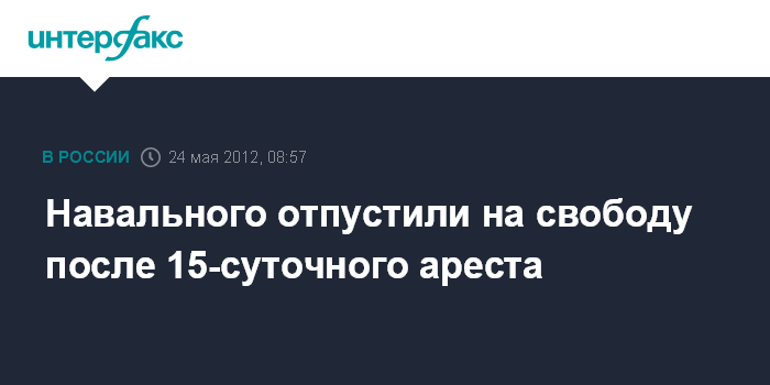 Москва. 24 мая. INTERFAX.RU - Оппозиционер Алексей Навальный утром в четверг вышел на свободу из спецприемника номер 1, где отбывал назначенные судом 15 суток административного ареста.
