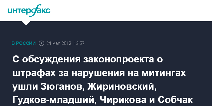 Москва. 24 мая. INTERFAX.RU - Некоторые оппозиционеры, включая Евгению Чирикову и Ксению Собчак, в четверг днем покинули зал заседания "круглого стола", где по инициативе "единороссов" проходит обсуждение принятого в первом чтении законопроекта о штрафах за нарушения на массовых акциях.