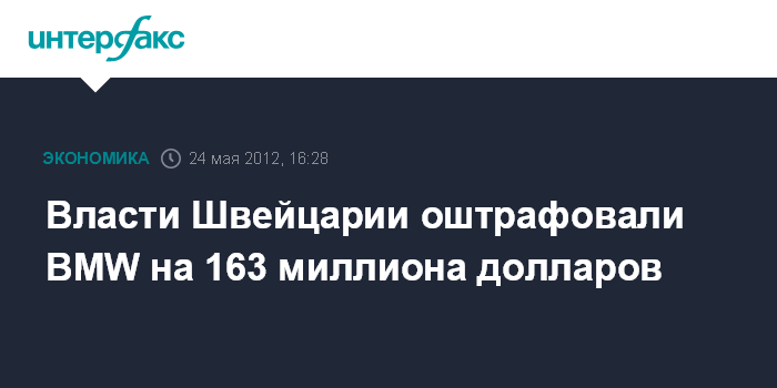Цюрих. 24 мая. INTERFAX.RU - Комиссия по конкуренции Швейцарии оштрафовала BMW AG, крупнейшего производителя автомобилей класса "люкс", на 156 млн швейцарских франков ($163 млн) за препятствование импорту в страну автомобилей своего производства, пишет газета The Wall Street Journal.