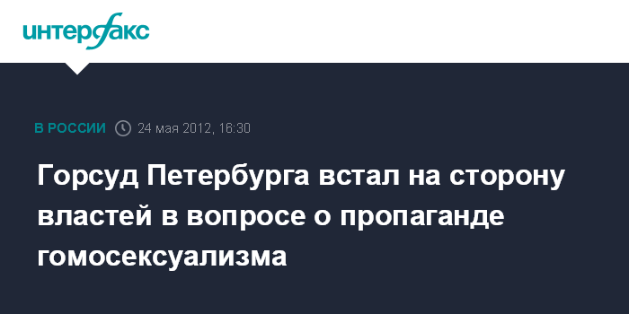 Санкт-Петербург. 24 мая. INTERFAX.RU - Городской суд Петербурга не нашел каких-либо противоречий законодательству в региональном законе о запрете на пропаганду гомосексуализма среди несовершеннолетних, сообщили "Интерфаксу" в четверг в ЛГБТ-организации "Выход".
