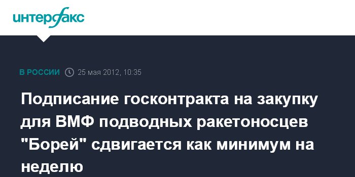"Предполагалось, что цены на "Бореи" удастся согласовать в четверг, а в пятницу в Северодвинске будет подписан контракт на их строительство. Теперь эта процедура откладывается, как минимум, на неделю", - сказал собеседник агентства.